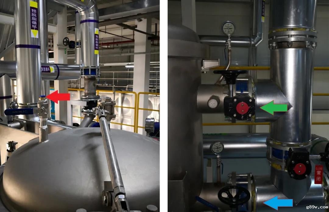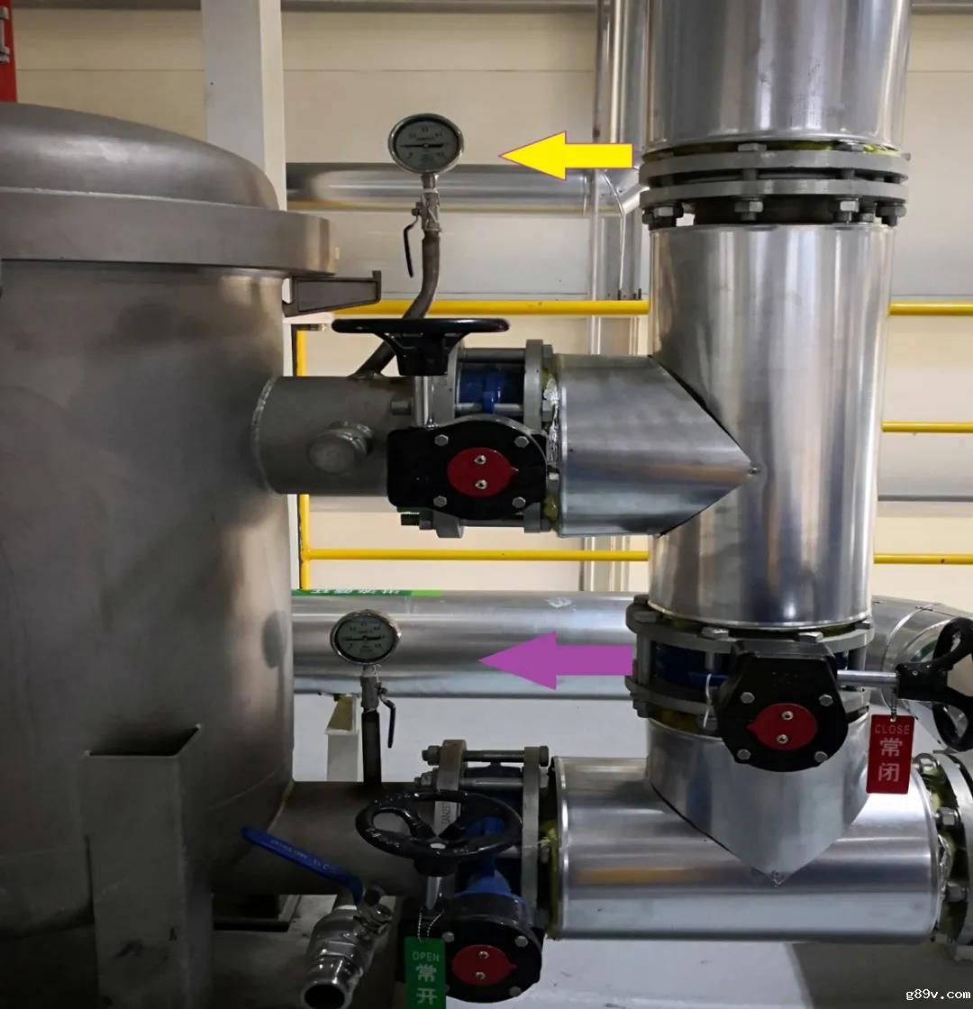- 检查设备进口(黄色箭头)压力表和出口(紫色箭头)压力表的压差区间在0.5~1公斤,准备更换过滤袋。