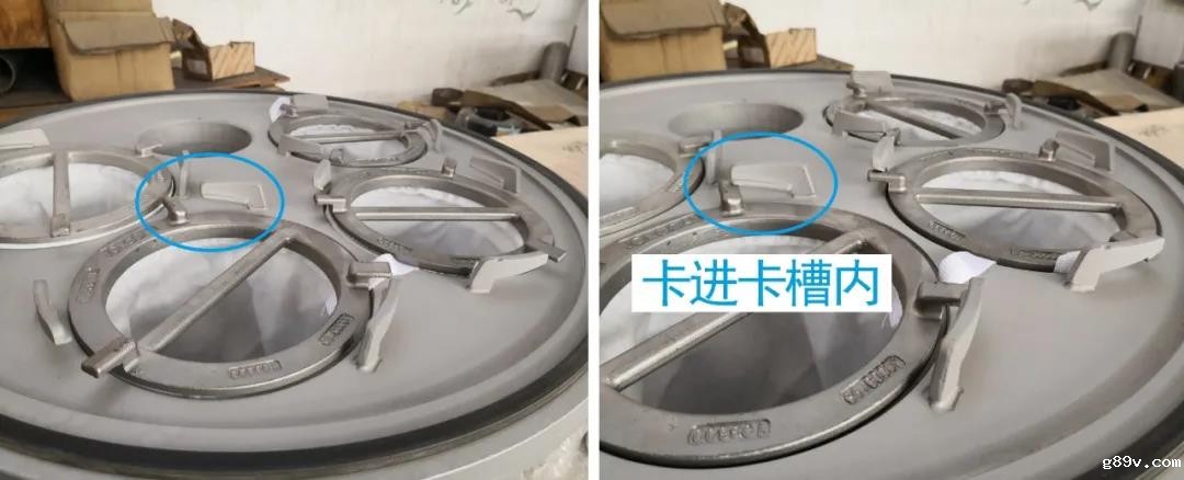 - 放上过滤袋卡环(左图),顺时针压紧滤袋卡环(右图),用扳手等工具进一步卡紧卡环。